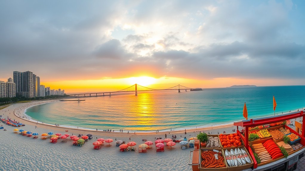 In Busan, you’ll find pristine beaches like Haeundae and Gwangalli, where you can lounge by day and feast on fresh seafood by night. Don’t miss Haedong Yonggungsa Temple perched on coastal cliffs—arrive early for sunrise views. Explore the colorful maze of Gamcheon Cultural Village and slurp authentic dwaeji gukbap (pork stew). The city’s efficient transport system makes hopping between sights a breeze. The coastal charm awaits beyond Seoul’s shadow.